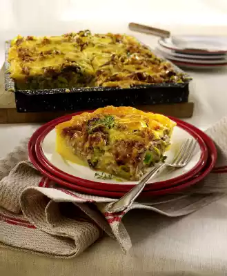 Add processed cheese and mix. Bring to the boil and simmer over a low heat for five minutes. Season again with salt and pepper. Remove the fat pan from the oven and place it on a grid. Sprinkle dough evenly with breadcrumbs. Spread the minced leek mixture on top. Sprinkle with cheese and bake at the same temperature for another 30 minutes on the bottom shelf. Ten minutes before the end of the baking time, increase the oven temperature (electric oven: 225 °C/ circulating air: 200 °C/ gas: level 4) Remove from the oven, cut into pieces and garnish with thyme
