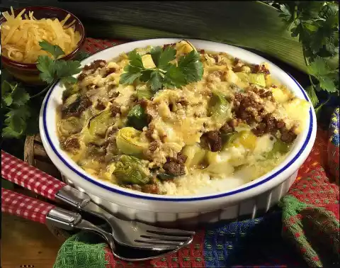 Puree, put into a casserole dish, spread leek mince sauce over it. Sprinkle with cheese and bake in a preheated oven (electric: 200°C/ gas: level 3) for 15 minutes. Serve garnished with parsley.