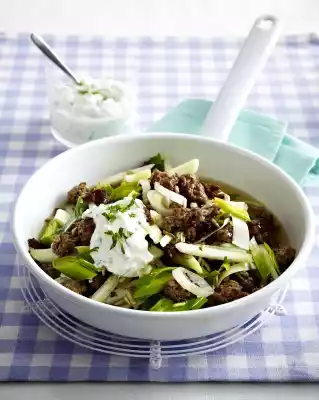2 Heat the oil in a frying pan. Fry the minced meat crumbs in it while turning. Season with salt and pepper and remove. Sauté the kohlrabi and leek in the frying fat. Season with salt and pepper. Add minced meat again.