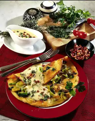 Stir the baking powder into the dough. Heat oil in a coated pan. Add the dough and bake for 1-2 minutes. Sprinkle 2/3 leek over it and continue baking for about 2 minutes. Turn the pancakes over and finish baking. Serve with remaining leek and sauce