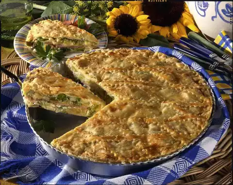 Fold in pineapple and let it cool down. Coarsely grate the cheese. Place 3 slices of puff pastry on top of each other and roll out into a circle (approx. 30 cm Ø). Place the pastry sheet in a casserole dish (approx. 26 cm Ø), leaving the rim slightly protruding. Prick the base several times with a fork. Place 2 more puff pastry slices on top of each other and roll out to a circle (30 cm Ø). Fill half of the leek into the baking dish. Spread the ham on top. Spread the cheese over it and add the remaining leek. Place the rolled out puff pastry sheet on top and press the edges together. Roll out the rest of the pastry to a plate (26 cm Ø).
