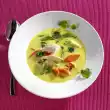 Add chicken stock to the leek and simmer for about 5 minutes. In the meantime, heat the remaining fat in a pan and fry the prawns in it for 3-5 minutes. Season with salt and pepper. Puree the soup with a hand blender and season to taste again. Arrange soup, remaining leek and king prawns on plates and serve sprinkled with pepper