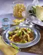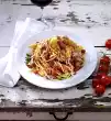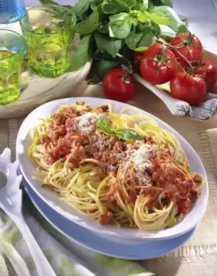 Stir the cream into the chopped sauce, bring to the boil briefly and season to taste. Drain the spaghetti and serve with the sauce. Sprinkle with Parmesan cheese and garnish if desired