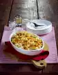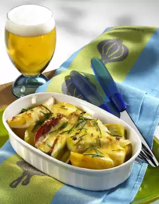 Wash the chives and cut into small rolls. Grate the gouda. Fill prepared vegetables and ham into a small form. Spread the sauce on top. Sprinkle with gouda. Bake in a preheated oven (electric: 200 °C/ gas: level 3) for about 12 minutes.