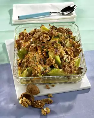 Place the leek pieces in a greased casserole dish and spread nut mixture on top. Bake in the preheated oven (electric cooker: 200 °C/circulating air: 175 °C/gas: level 3) for approx. 25 minutes. Sprinkle the rest of the nuts on top about 5 minutes before the end of the baking time. Wash the chives, chop finely and sprinkle over the top. Goes well with mashed potatoes