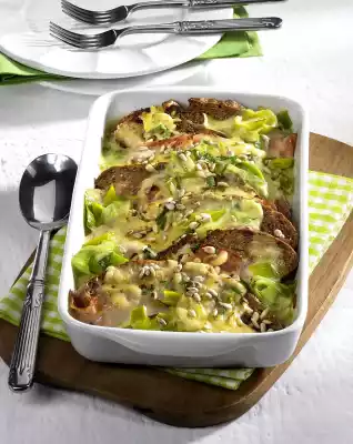 Stir 75 g cheese bit by bit into the sauce, season with salt and pepper. Fold the ham around 1 slice of bread. Layer ham sandwiches and sauce in a greased casserole dish. Sprinkle with 25 g cheese. Bake in a preheated oven (electric cooker: 200 °C/ convection oven: 175 °C/ gas: level 3) for approx. 15 minutes. Serve sprinkled with parsley