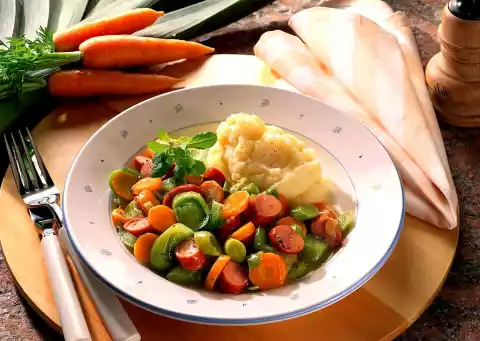 Clean, wash and cut carrots and leek into thick slices. Cut the sausage into slices. Peel and finely dice onions and fry them in hot oil until translucent. Add prepared ingredients and deglaze with mixed broth. Season to taste with salt, pepper and thyme and cook for 10 minutes. Prepare flake puree according to package instructions. Serve goulash and puree on a plate