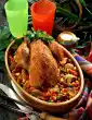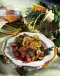 Add half of the orange juice and vegetables to the legs. During the first 45 minutes, cover the legs 2-3 times with frying stock. Peel and quarter the quinces and remove the seeds. Cut quince quarters into slices. Heat red cabbage, add quince slices and currant jelly. Simmer dumplings in boiling, slightly salted water for about 7 minutes. Cut the gingerbread into small pieces. Peel and chop 1 onion. Skim 2 tablespoons of goose fat and heat it up. Fry the diced onion for about 3 minutes while turning, add the cake and flour about 1 minute before the end of the frying time and mix well. Deglaze with red wine and remaining orange juice while stirring and let simmer for 1-2 minutes. Drain the dumplings. Spread goose legs with orange marmalade. Wash the thyme and pluck the leaves.