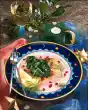 Fry the diced onions, chanterelles and savoy cabbage slices for 10 minutes. Season with salt and pepper. Deglaze with 100 ml water, steam for another 5 minutes. Bring 3/8 litres of water and 1/2 teaspoon salt to the boil. Remove the pot from the stove. Add milk. Stir in the puree flakes briefly. Pour the puree into a piping bag with a star-shaped spout. Spray small dots onto a baking tray lined with baking paper. Just before serving, bake in a preheated oven (electric cooker: 200 °C/ gas: level 3). Loosen the roasting set, add red wine and puree. Wash, chop and add thyme. Season to taste with salt and pepper. Serve legs, duchess potatoes, vegetables and sauce in portions garnished with fresh herbs