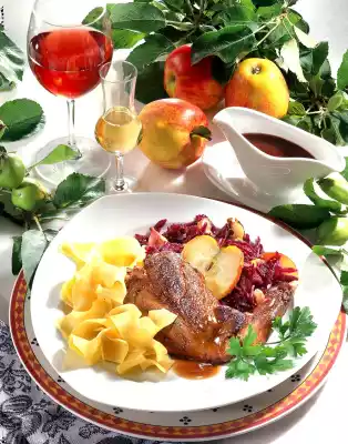 Peel the shallots. Sauté in 1 tbsp. hot fat. Add red cabbage and apple juice. Cover and stew for about 20 minutes. Wash, core and chop the apple. Add to the cabbage 5 minutes before the end of the cooking time and cook. Season to taste with sugar and salt