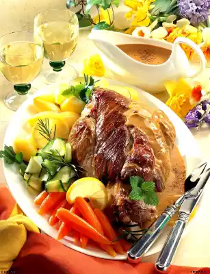 Arrange the leg with vegetables and sauce. Serve garnished with fresh herbs and lemon.