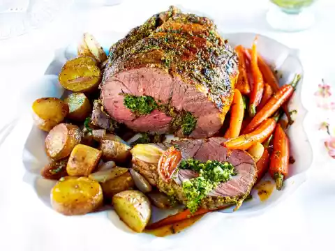 Mix everything with 3 tablespoons of oil. Season with salt and pepper. Arrange roast and vegetables on a plate, add Gremolata.