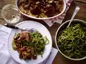Spread all the vegetables around the meat about 30 minutes before the end of the frying time.