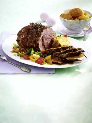 Place the meat on a fat pan and spread the onion, garlic and carrots around it. Bake in the preheated oven (electric cooker: 225 °C/ convection oven: 200 °C/ gas: level 4) for approx. 40 minutes. After about 30 minutes, deglaze with stock and broth. After approx. 40 minutes of baking time, switch the oven down (electric oven: 150 °C/ convection oven: 125 °C/ gas: level 1) and bake for another 60-70 minutes