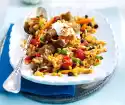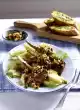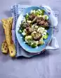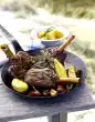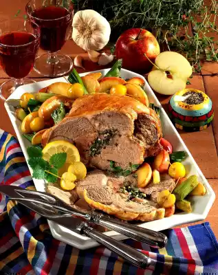 Wash leg of lamb, dab dry and season with salt and pepper. Peel garlic and chop finely. Wash and chop the herbs. Mix herbs and garlic and spread on the meat. Roll up the meat, fix it with wooden skewers and wrap it with kitchen string. Place leg of lamb on the fat pan of the oven and roast in the preheated oven (electric cooker: 175 °C/ gas: level 2) for about 2 1/2 hours. Gradually add 1/8 litre of water. In the meantime, clean, wash and chop the spring onions. Wash and quarter the apples and cut out the cores. Cut the apple quarters into slices. Add the apple slices, leek vegetables and baby apples to the leg of lamb approx. 15 minutes before the end of the cooking time and cook with it. Season vegetables with salt and pepper. Remove the meat and let it rest for a while. Arrange meat and vegetables on a plate. Garnish with a slice of lemon and lemon balm