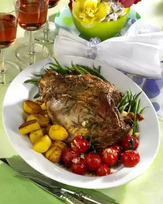 Cook for 30 minutes, then reduce the temperature (electric oven: 175 °C/ convection oven: 150 °C/ gas: level 2) and roast for another 1 1/2 hours. Wash, peel and chop the potatoes. Wash tomatoes, dab dry. Add the potatoes to the lamb 30 minutes before the end of the cooking time. Sprinkle with salt and sprinkle with 1 tablespoon of olive oil. Sprinkle tomatoes with coarse salt and cook for the last 10 minutes. For the bean vegetables, clean and wash the beans, cook in boiling salted water for 8-10 minutes. Peel shallots and cut into rings. Cut bacon into wide strips. Leave the bacon crispy, fry the shallot in the bacon fat until translucent. Drain the beans, let them drip off and add to the bacon.