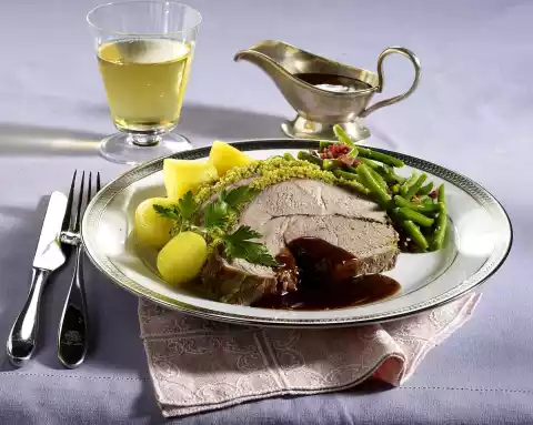 Pour broth into the gravy and pour it through a sieve into a small pot. Bring the sauce to the boil, thicken slightly with sauce thickener and season with salt and pepper. Cut meat into slices, arrange with sauce, potatoes and beans and garnish with parsley.