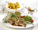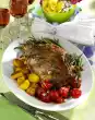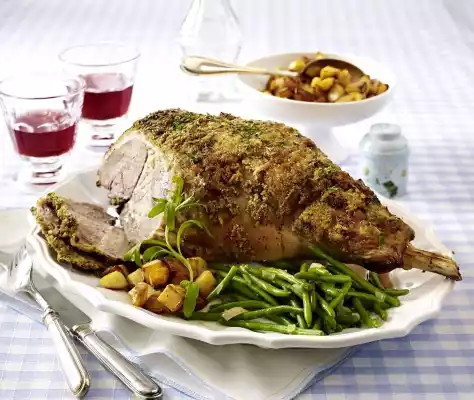 100 g butter, mustard, breadcrumbs, diced onion and herbs, up to 1 tablespoon for sprinkling, knead and season with salt and pepper. Spread on the leg of lamb and smooth it down. Place on the fat pan of the oven.