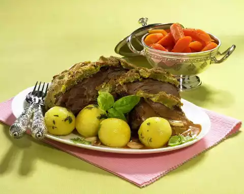 Place the onion slices and lamb bones on the fat pan. After another 30 minutes, deglaze the roast with 1/2 litre of water and wine. Spread the paste over the roast and cook for about 30 minutes. For the dumplings, toast the rest of the toast and dice finely.