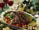 Peel a carrot and celery, clean the leek, chop everything into small pieces. Peel and quarter the onion. Arrange the vegetables and onion around the leg of lamb. Braise in the preheated oven (electric cooker: 175 °C/ gas: level 2) for about 1 1/4 hours.