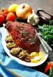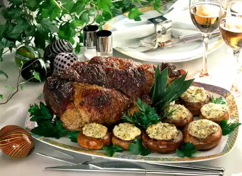 Remove the leg of lamb from the roaster and keep it warm. Bake the mushrooms in the switched off hot oven for about 10 minutes until the cheese melts. Pour the roast stock through a sieve into a pot, bring to the boil.