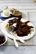 Take out the roast, remove the bacon. Wrap leg in tin foil. Pour roast stock with vegetables through a sieve into a pot. Add cherries with juice, bring to the boil. Mix 3 tablespoons of water with starch, stir into the sauce, simmer for about 2 minutes.