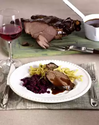 Remove the finished meat from the stock, wrap in aluminium foil and keep warm. Pour stock through a sieve into a pot, add elderberry juice and vinegar. Bring the stock to the boil, boil down to approx. 500 ml over low heat. Mix 1 tsp. starch with 1 tbsp. water, stir and pour into the red cabbage, simmer for approx. 5 minutes, remove from heat