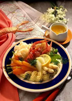 Spray one potato spiral each onto the preheated plates. Heat the butter. Arrange vegetables and crayfish on the mashed potatoes. Pour the hot butter over them. Serve garnished with dill flags and lemon wheels.