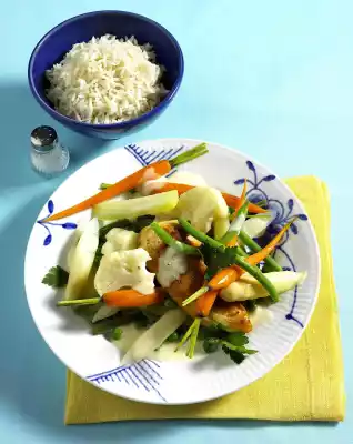 Remove the vegetables. Measure out 400 ml broth. Knead flour and butter. Boil up measured stock and cream, stir in flour butter. Heat the vegetables in the sauce and season with salt and pepper. Rice tastes good with it.