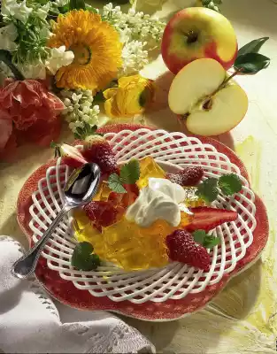 Pour liquid jelly into a flat form and chill overnight. Wash, clean and halve the strawberries and mix with the remaining sugar. Remove the jelly from the edge of the mould with a sharp knife, hold it briefly in hot water and then turn it over.