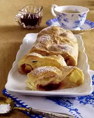 Remove the strudel from the oven and dust with icing sugar. Strudel tastes hot or cold. Add cherry sauce
