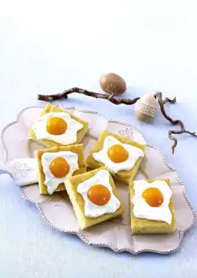 Season to taste with remaining lemon juice. Cut the cake into about 24 pieces. Spread cream quark evenly on the cake pieces. Spread the cream with a teaspoon in such a way that you get a fried egg shape. Place 1 apricot half as egg yolk on each cake piece
