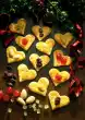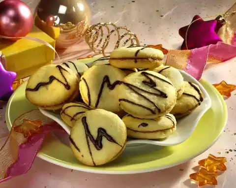 Remove from the oven, carefully remove from the baking paper, place on a grid and allow to cool well. Spread half of the cookies (the undersides) with rosehip jam. Place one cookie on each side. Coarsely chop the chocolate coating, place in a bowl and melt in a hot water bath. Leave to cool a little. Pour into a small freezer bag and cut off a corner with sharp scissors. Decorate the cookies with the chocolate coating and let them dry