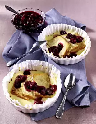 Cut lemon cake into slices. Spread on the pudding, spread about 1 tbsp. stewed cherries on the cake slices. Bake in the preheated oven (electric cooker: 175 °C/ convection oven: 150 °C/ gas: see manufacturer) for about 5 minutes.