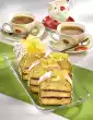 Peel and dice the kiwis. Peel the skin from the bananas. Cut the bananas into slices. Mix orange juice, remaining lemon juice and brown sugar well. Mix in fruit. Cut cake into rhombs and serve with fruit salad. Decorate as you like with lemon balm and add cream if necessary