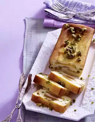 Caramelise 50 g of sugar in a pot, quickly stir in 20 g of pistachios with a wooden spoon and place on a piece of baking paper. Let them cool down for about 15 minutes and chop them roughly. Remove the cake and let it cool down on a cake rack. Carefully turn out of the tin, arrange on a plate and sprinkle with pistachio brittle