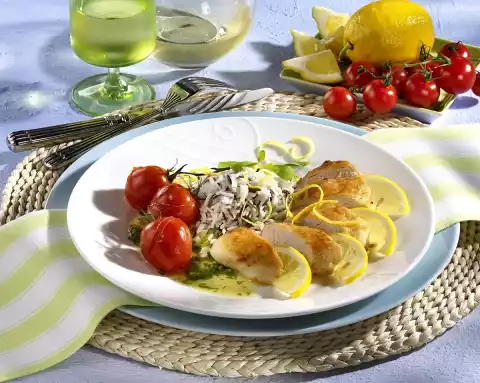 Cut the chicken fillets open, arrange with lemon slices. Serve with rice, braised tomatoes and sauce. Garnish with tarragon and lemon peel.