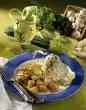 Lift the chicken out of the stew. Bring the stock to the boil, stir the cornflour with a little cold water until smooth and stir into the stock. Let it boil again for about 1 minute. Season to taste with salt and pepper. Carve the chicken into small portion pieces and arrange on plates with the coriander rice.
