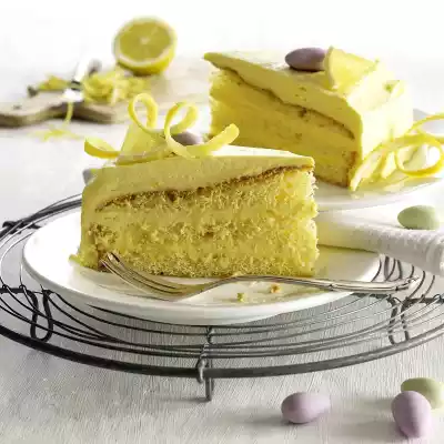 Place the middle cake base on top and press down slightly. Spread another 1/4 of the cream on top, place the lid on top and press down. Remove the cake ring. Spread the cake with the remaining cream all around. Put it in a cool place overnight. Cut the lemon spirals into 3 pieces each. Decorate the cake with Viennese almonds, lemon spirals and halved, candied lemon corners