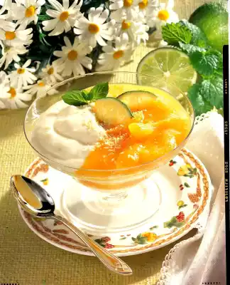Roast the grated coconut in a pan without fat until golden brown. Sprinkle over the desserts just before serving. Decorate as desired with slices of lime and lemon balm leaves.