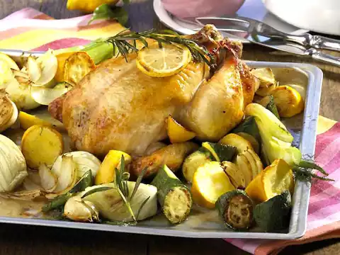 Clean, wash and cut the vegetables into pieces. Peel 3 onions and cut into slices. After about 1 hour, spread everything with garlic cloves, the rest rosemary and lemon slices around the chicken, season. Turn the vegetables from time to time. Season to taste and arrange everything. Goes well with farmhouse bread or roast potatoes