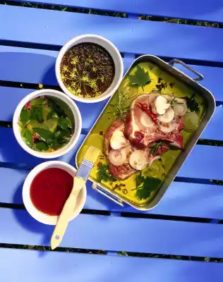Wash the lemon and cut into slices. Wash mint leaves and pluck. Peel ginger and chop very finely. Mix the prepared ingredients, pink berries and olive oil and drizzle onto the respective piece of meat. Cover and leave to stand for about 30 minutes.
