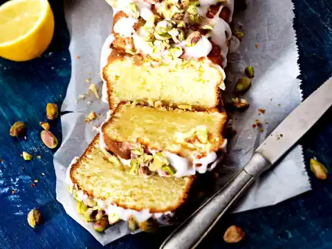 Remove the pistachios from their shells. Stir icing sugar and 3 tablespoons of water until smooth. Take the finished cake out of the oven, let it rest in the mould for about 10 minutes, turn out of the mould and let it cool down. Spread the icing on the cake and sprinkle with pistachios