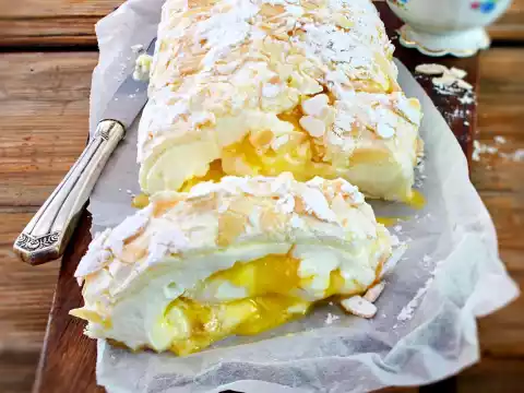 Spread the mascarpone cream evenly on the meringue base, leaving a rim of about 2 cm all around. Put curd as a blob on the cream and smooth it down. Roll up from the short side using the baking paper. Arrange on a plate, dust with 1-2 tbsp. icing sugar and serve immediately.