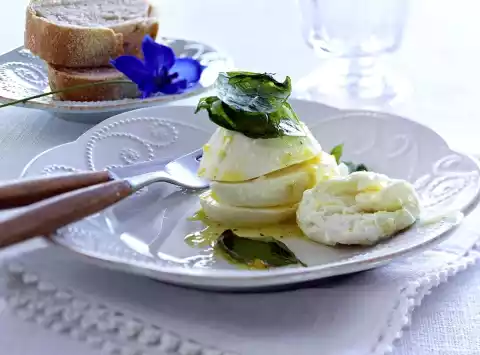 Arrange the mozzarella with the lemon oil and basil. Baguette goes well with it.