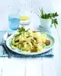 Pour the pasta into a sieve, quench and drain. Add the noodles to the oil, mix and heat. Wash parsley, shake dry, pluck off some leaves, cut remaining parsley into fine strips.
