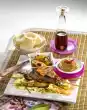 Wash the coriander greens, dab dry and chop. Remove the chicken fillets from the sauce. Stir in the sauce thickener and bring to the boil again briefly. Season to taste with salt, pepper and 1-2 tablespoons of lemon juice. Pour the pasta onto a sieve, drain well and mix with the sauce. Cut the chicken fillets lengthwise into slices and arrange on plates with the noodles. Sprinkle with coriander green and lemon julienne. Garnish with lemon slices