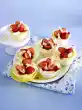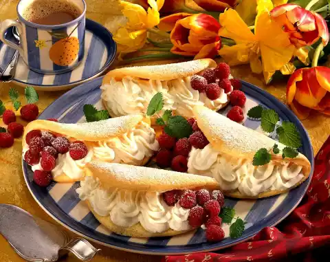 Whip cream until stiff and fold into the quark. Turn the finished omelettes onto a cloth, moisten baking paper with cold water and peel. Fold the omelettes carefully and let them cool down. Fill lemon curd into a piping bag with a star-shaped spout and fill the omelettes with it and cover with raspberries. Dust the omelettes with icing sugar and serve decorated with lemon balm as desired. Makes 8 pieces