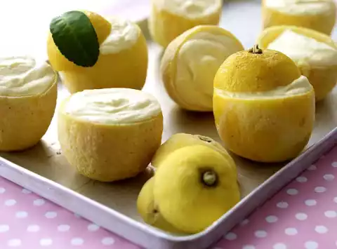 Spread the mixture into the hollowed lemons. Freeze the lid as well (put them next to each other!). Freeze both in the freezer for at least 3 hours. Remove the lemons and the lid, place the lid on the lemons, let them stand at room temperature for about 10 minutes, then serve