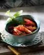 Cut off the upper third of the lemons as a lid. Carefully squeeze the lid and lemons. Measure out 500 ml lemon juice. Put it into a pot with butter and 175 g sugar, boil down to about 300 ml, remove from heat and let it cool down. In the meantime, carefully scrape the remaining pulp out of the lemons and the lids with a teaspoon. Cut the bottom of the lemons straight